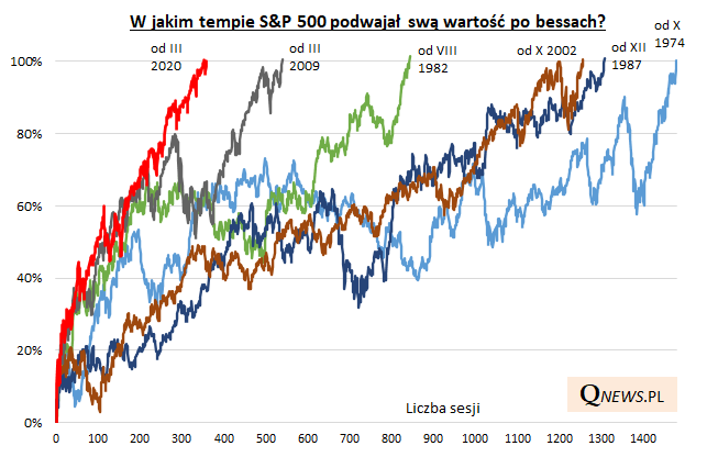 W trakcie pandemicznego krachu pisaliśmy o najszybszym w historii tempie spadku amerykańskiego S&P 500. Potem pisaliśmy o rekordowym tempie odrobienia strat. A teraz można mówić o rekordowym ... podwojeniu wartości amerykańskiego benchmarku, licząc od dna wyprzedaży. Tym razem osiągnięcie tego celu zajęło indeksowi zaledwie 353 sesje, podczas gdy poprzedni rekord wynosił 542 dni robocze.
