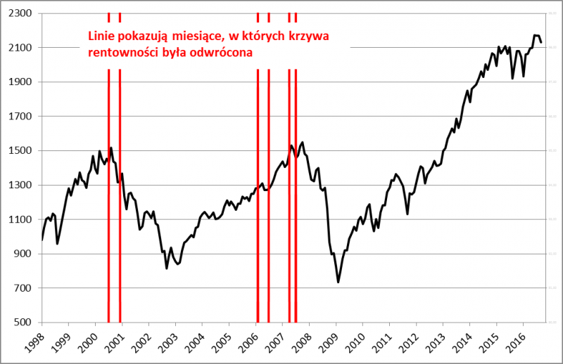 Co krzywa dochodowości ma wspólnego z akcjami? Otóż odwrócona krzywa bywa interpretowana jako sygnał, że coś niedobrego dzieje się w gospodarce. Na przestrzeni ostatniego półwiecza wszystkie siedem recesji w USA było poprzedzonych przez odwróconą krzywą. Ten złowieszczy sygnał poprzedzał również dwie ostatnie wielkie bessy na giełdach (lata 2008 oraz 2000-2002).