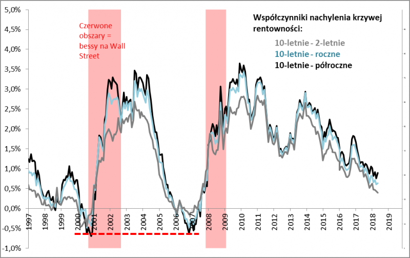 Jeśli szukać bardziej precyzyjnej wskazówki, można zwrócić uwagę na fakt, że niektóre z omawianych wskaźników nachylenia krzywej przed nadejściem bessy zeszły relatywnie głęboko poniżej zera. Przykładowo wskaźnik pokazujący różnicę rentowności papierów 10-letnich i półrocznych w obu przypadkach zszedł do ok. -0,6 pkt. proc.