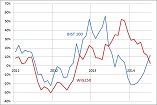 Jeśli chodzi o tureckie akcje, to najlepszy moment do ich zakupów (12-mies. stopa zwrotu na poziomie -22% w styczniu) jest już za nami. Według powyższej tabeli teraz należy liczyć się już z dużo mniejszym potencjałem wzrostowym w kolejnych 12 mies. Inaczej diagnoza wygląda w przypadku akcji polskich „maluchów”. 12-mies. stopa zwrotu z WIG250 jest już o krok od spadku poniżej zera. Być może to nie jest jeszcze optymalny moment do zakupów, ale warto zwrócić uwagę, że nawet gdyby WIG250 przestał już spadać i pozostał po prostu na obecnych poziomach, to i tak 12-mies. stopa zwrotu nadal by się obniżała, aż do -19% na koniec listopada br. A to już byłyby z historycznego punktu widzenia dość atrakcyjne poziomy.