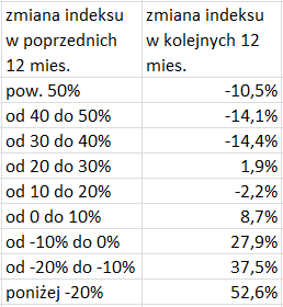 czywiście nie należy się mocno przywiązywać do konkretnych liczb w powyższej tabeli, niemniej taki mechanizm działa także na polskim rynku akcji. Weźmy przykładowo indeks WIG250. Na jesieni ub.r. 12-miesięczna stopa zwrotu w jego przypadku przekroczyła 50%. Inwestorzy skuszeni tymi historycznymi zyskami dzisiaj liczą straty – od tego momentu indeks małych spółek osunął się o ok. 18%. Z kolei ktoś, kto kupował akcje „maluchów” w momencie gdy 12-mies. stopa zwrotu była głęboko na minusie (-30% w grudniu 2011), w kolejnych 12 mies. mógł zarobić prawie 23%.