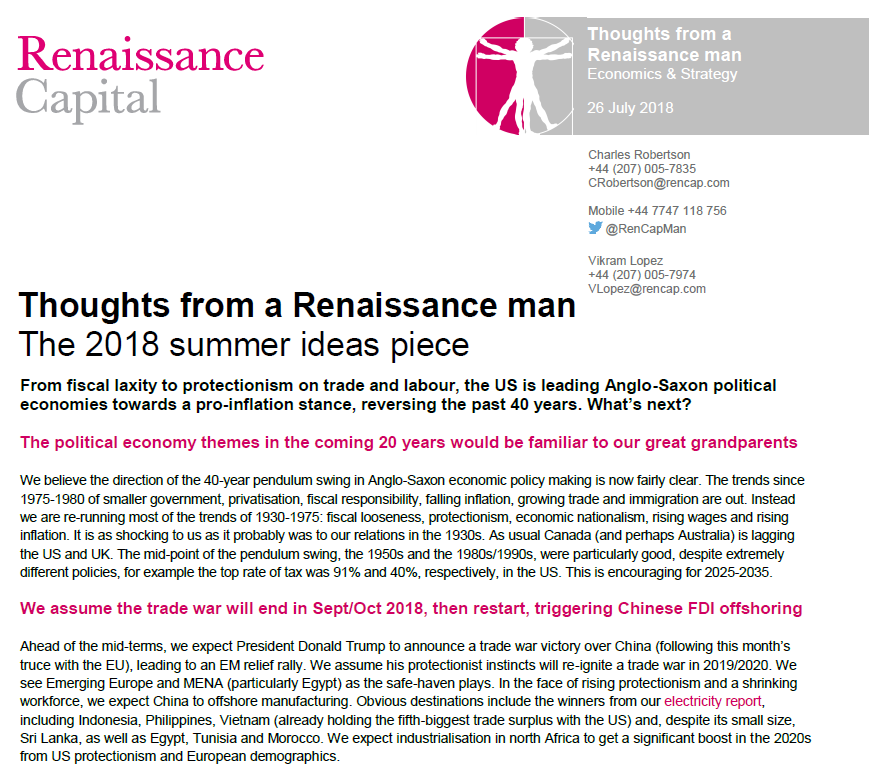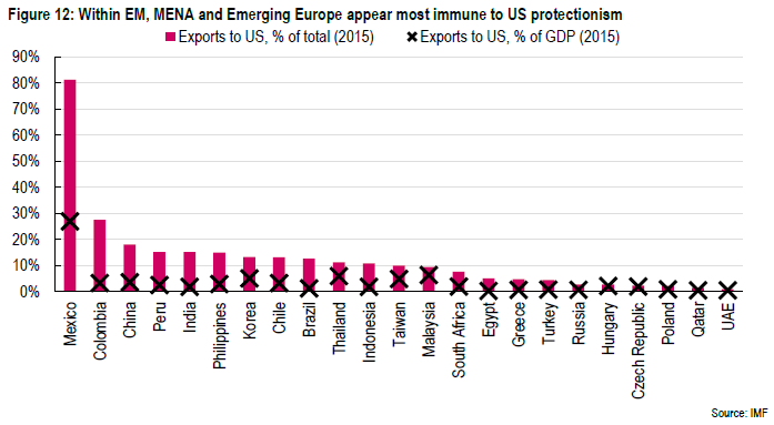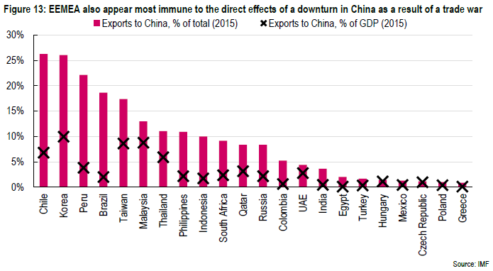 Temat wojen handlowych/celnych jest obecnie z pewnością najgoręcej dyskutowaną kwestią na rynkach (niedawno pisaliśmy, że w globalnym sondażu BAML zarządzający funduszami na świecie są wyjątkowo zgodni co do tego, że jest to obecnie największe zagrożenie). Specjalizujący się w rynkach wschodzących broker Renaissance Capital spróbował odpowiedzieć na pytanie które emerging markets są bardziej, a które mniej wrażliwe na podwyżki ceł przez USA.