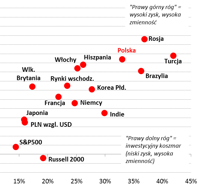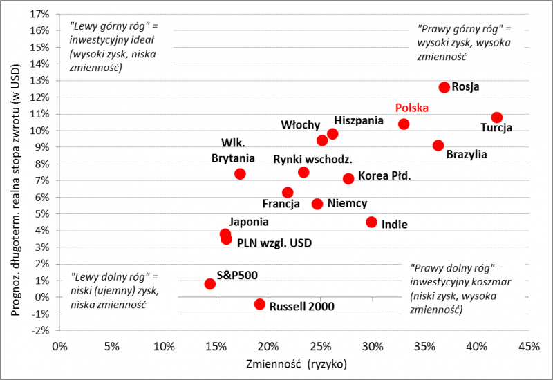 Jeśli pod uwagę weźmiemy relację między prognozowanymi zyskami, a zmiennością, to polskie akcje nie wypadają już tak świetnie. Zauważmy, że tylko nieco mniejsze stopy zwrotu prognozowane są dla „sztandarowych” krajów z grupy PIIGS (Hiszpania, Włochy), ale za to w ich przypadku zmienność wyników ma być znacząco niższa (czyli mają być bardziej przewidywalne i stabilne w poszczególnych latach).
