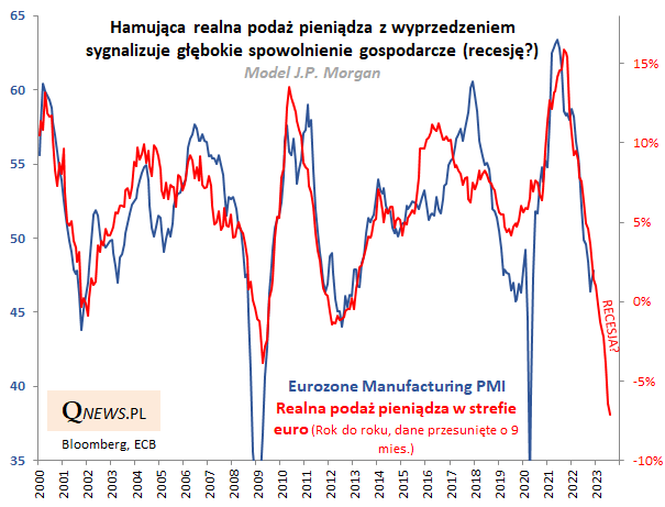 Realna podaż pieniądza w strefie euro, która wg modelu zaczerpnięto przez nas od J.P. Morgan ma moc wyprzedzającą względem PMI, ciągle bezlitośnie kreuje wizję dalszego, recesyjnego spadku.
