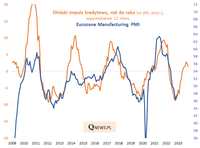 O ile jeszcze do niedawna wnioski płynące z powyższej zależności były potwierdzone przez drugi z obserwowanych przez nas wskaźników - tzw. chiński impuls kredytowy (wielkość akcji kredytowej wyrażona jako procent chińskiego PKB) - to teraz sygnały płynące z Chin malują zupełnie odmienny obraz. Jeśli wierzyć chińskiemu impulsowi kredytowemu, europejski (i polski) PMI ma przed sobą wizję dalszej zwyżki.