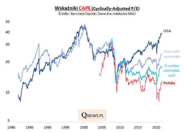 - jeszcze niżej wyceniana jest grupa dziewięciu rynków wschodzących "pokrywanych" przez Barclays (CAPE na poziomie 17,9 na koniec VIII);
