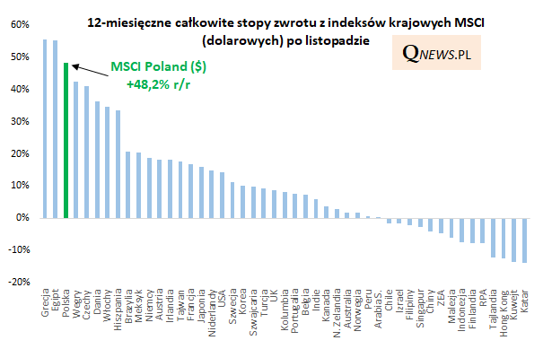 Jakiś czas temu pisaliśmy, że polskie akcje (a precyzyjnie: globalnie rozpoznawalny indeks MSCI Poland, grupujący kilkanaście największych spółek), znalazły się w ścisłej światowej czołówce, jeśli chodzi o stopy zwrotu za ostatnie 12 miesięcy. Dobra wiadomość jest taka, że na koniec listopada rodzimy rynek ciągle był na globalnym podium, ze stopą zwrotu równą +48,2 proc. (to wynik wyrażony w dolarze, uwzględniający dywidendy).