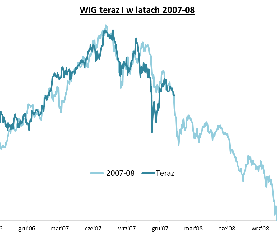 Kiedy w końcówce lutego, tuż po rozpoczęciu rosyjskiej agresji przeciwko Ukrainie, WIG znalazł się ok. 25 proc. poniżej ubiegłorocznego rekordu wszech czasów, zachowanie indeksu zestawiliśmy z innymi historycznymi, równie silnymi zniżkami ze szczytów hossy. Jednym z przypadków najbardziej zbliżonych pod względem zachowania WIG-u okazał się ten z lat 2007-2008.