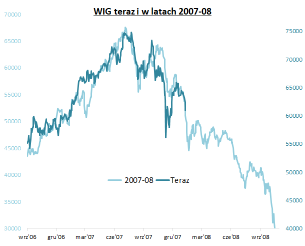 Zachowanie WIG-u od jesieni ub.r. do złudzenia przypomina ścieżkę, po jakiej indeks schodził ze szczytów hossy w latach 2007-2008. Skojarzenia z tamtym bolesnym okresem wywołuje też szok naftowy i jastrzębie działania banków centralnych. Na szczęście prostą powtórkę głębokiej bessy z 2008 roku trudno wyobrazić sobie przy tak niskich wycenach akcji na GPW.