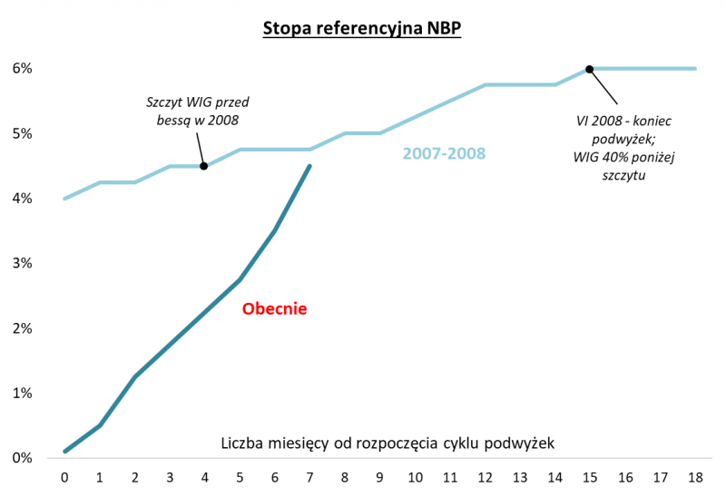 W Polsce owe zacieśnianie przybrało postać trwającej – mniej więcej od czasu ustanowienia przez WIG szczytu – serii podwyżek stóp procentowych. W obecnym cyklu mieliśmy do tej pory już siedem podwyżek stopy referencyjnej NBP. Więcej – osiem – odnotowano tylko i wyłącznie w latach … 2007-2008 (ostatnia, ósma miała miejsce w końcówce czerwca 2008). Z kolei skala podwyżek jest już dużo większa niż wtedy, bo tym razem stopy wystartowały praktycznie z zerowego pułapu. Negatywny impuls monetarny jest więc w ujęciu relatywnym nawet silniejszy niż w 2008 roku.