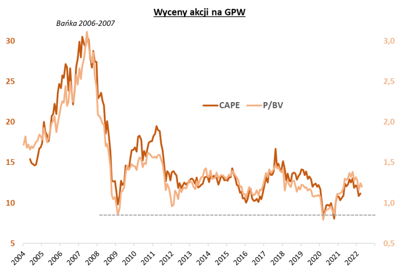 Giełdowa katastrofa 2008 roku wynikała nie tylko z czynników takich jak wspomniany szok naftowy i szok monetarny, lecz również z wcześniejszych niebotycznych poziomów wycen na GPW (będących pokłosiem historycznej hossy na rynkach wschodzących). Obecna sytuacja kompletnie nie przypomina tamtego stanu rzeczy. Przykładowo wskaźnik ceny do wartości księgowej (P/BV) na szczycie przed bessą 2008 roku wynosił (wg danych Bloomberga) ok. 3,1 – teraz dla porównania wynosi ok. 1,2, a więc jest niższy o … 60 proc. Z kolei CAPE (skorygowane cyklicznie P/E) to obecnie (dane za marzec) 11,2, zaś na szczytach w 2008 sięgał 30,6 – również jest zatem o ponad 60 proc. niżej.