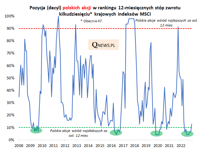 Poprawa widoczna w ostatnich trzech miesiącach to być może dobry zwiastun na 2023 rok. Wśród warunków dalszego przesuwania się w górę w globalnym rankingu wymienić można m.in. dalsze osłabienie dolara (z którym krajowe akcje są ujemnie skorelowane), czy też brak dużych negatywnych niespodzianek od polityków.