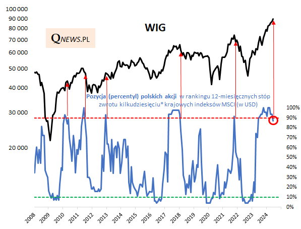 Jakie wnioski? Wypadnięcie ze ścisłej globalnej czołówki może (ale nie musi) zwiastować większe kłopoty krajowym akcjom. Takie sygnały pojawiły się tuż po odnotowaniu szczytów hossy w latach 2021, 2018 i 2011 - w tych przypadkach WIG czekała bolesna przecena. Z kolei w latach 2013 i 2010 skończyło się tylko na przejściowej zadyszce (jeśli odwołamy się do pierwszego wykresu, to w tych przypadkach degradacja polskich walorów była bardziej stopniowa).
