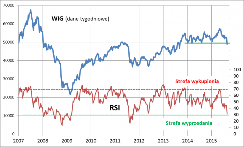 Warto też zwrócić na jeszcze jedną kwestię. Śledzony przez nas, sprawdzony historycznie wskaźnik RSI (wg danych tygodniowych) zawędrował już w pobliże strefy wyprzedania (przy założeniu, że cały tydzień skończyłby się na wczorajszym poziomie). To poziom najniższy od jesieni 2011 r. - to kolejna wskazówka, że mamy do czynienia z wyprzedażą w zaawansowanej fazie.