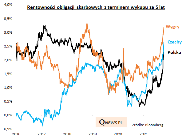 Nic zatem dziwnego, że polski rynek finansowy dyskontuje w ostatnim czasie kolejne podwyżki stóp w naszym kraju. Co ciekawe wzrost rentowności polskich obligacji skarbowych dużo szybciej "goni" za rosnącymi rentownościami w innych krajach regionu. Innymi słowy dostosowanie na rynku obligacji jest dużo bardziej zaawansowane niż w samej polityce monetarnej.