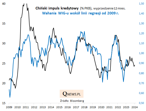 Zależności te są jeszcze lepiej widoczne, jeśli na wykres impulsu nałożymy WIG w wersji "oczyszczonej" z wieloletniej tendencji wzrostowej (czyli pozostawimy tylko cykliczne wahania indeksu wokół tzw. linii regresji). Widać, że zachowanie WIG-u cały czas ładnie wpisuje się w projekcję opartą na chińskim impulsie. Dobra wiadomość jest taka, że po ostatniej korekcie znów widać pewną przestrzeń do zwyżki na GPW, zanim ścieżka dyktowana przez impuls z Chin zacznie na nowo zakręcać w dół w drugiej połowie roku (pocieszające jest, że ten "zakręt" w dół nie powinien być tak dramatyczny jak w 2022 roku).