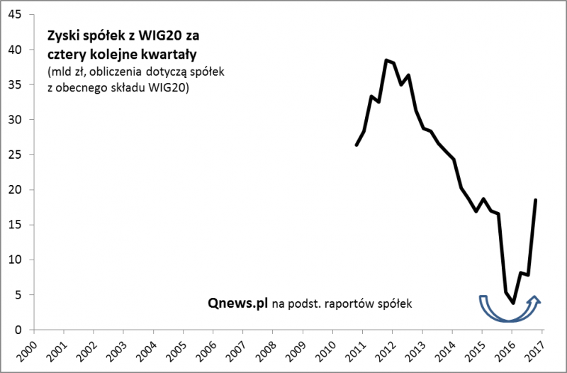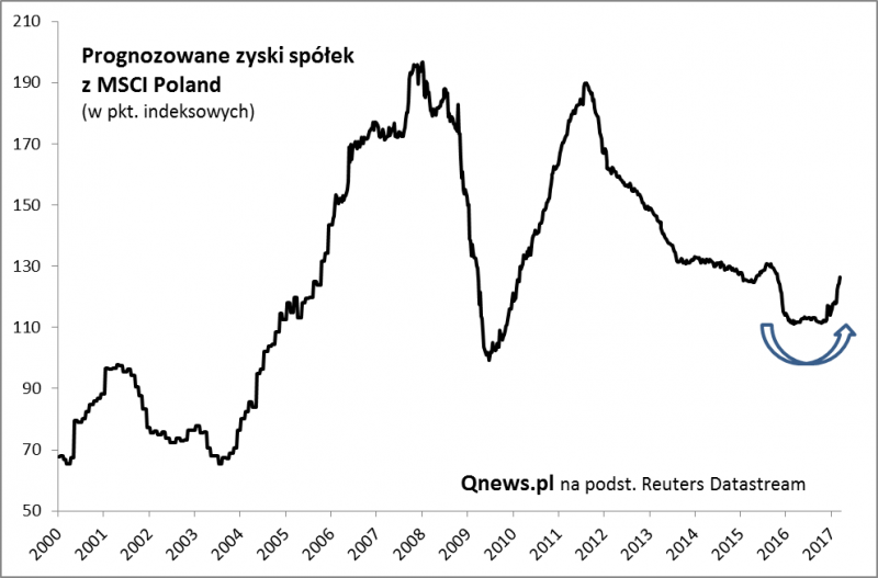 Wygląda więc na to, że trend spadkowy zysków trwający od 2011 roku dobiegł końca i mamy przełom. Przełom porównywalny z rokiem 2009 lub 2003. Ponieważ prognozowane zyski widoczne na wykresie poruszały się historycznie w dość stabilnych trendach, więc można mieć uzasadnioną nadzieję na kontynuację poprawy w perspektywie co najmniej kilkunastu miesięcy. Tym bardziej, że poprawa startuje z niskiego pułapu.