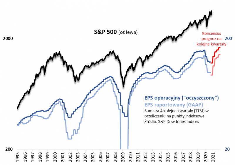 Już przy okazji poprzednich analiz kwartalnych podkreślaliśmy, że tak szybkie sięgnięcie przez flagowy indeks Wall Street po nowe rekordy jest sporym zaskoczeniem in plus, gdyż przy okazji poprzednich dwóch recesji S&P 500 do historycznych maksimów powracał dużo później niż zysk na akcję. Innymi słowy, to zyski najpierw sięgały po nowe rekordy, a dopiero potem ceny akcji. Tym razem jest zupełnie odwrotnie.