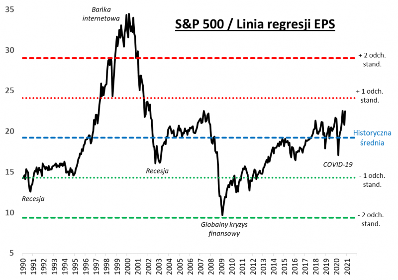 Przyjrzyjmy się jeszcze zyskom z długoterminowej perspektywy. Na drugim wykresie pokazujemy, że gdyby prognozy analityków się sprawdziły, to za mniej więcej rok EPS powróci do niejako uzasadnionego historycznie poziomu wynikającego z tzw. linii regresji. Linia ta pokazuje długofalową tendencję w zyskach począwszy od lat 90.