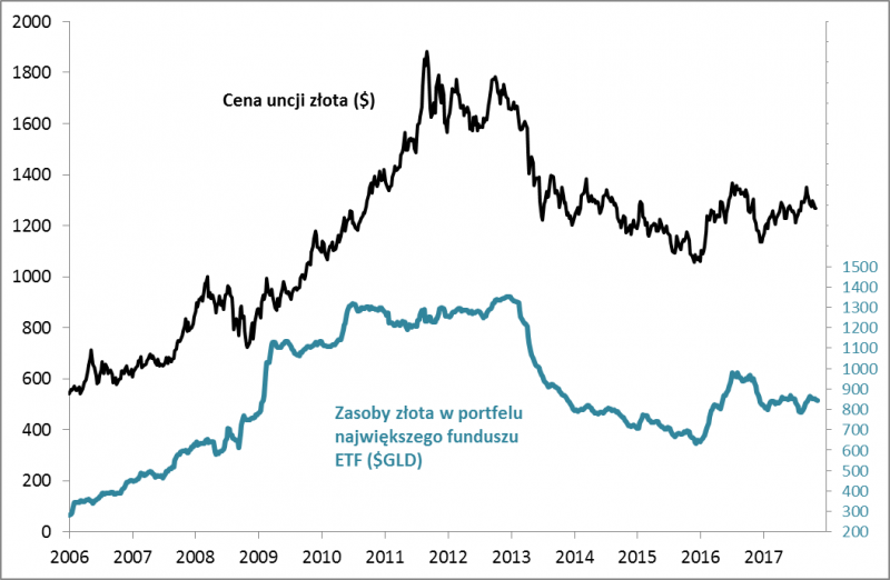 Z danych WGC wynika też, że mizerny jest w tym roku popyt ze strony funduszy typu ETF, które złoto kupują wtedy, gdy otrzymują wpłaty gotówki od klientów. Z naszych własnych dociekań wynika, że w tym roku zasoby największego ETF-a właściwie stoją w miejscu.