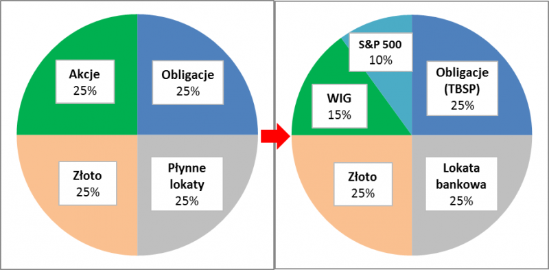 Rys. 1. „Portfel Permanentny” w wersji pierwotnej i po naszym przykładowym uszczegółowieniu na potrzeby polskiego inwestora