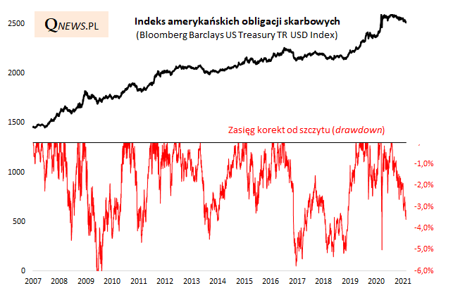 Korekta spadkowa na amerykańskim rynku "skarbówek" zbliża się do -4% od szczytu. To już dość okazała przecena, choć na przestrzeni ostatniej dekady zdarzały się większe ruchy spadkowe, rzędu 5-6%.