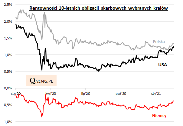 Reasumując, rosnące oczekiwania na normalizację sytuacji w gospodarkach przyczyniają się do wzrostu rentowności obligacji skarbowych, co najbardziej widoczne jest w USA. Wzrost rentowności to spadek cen - indeksy obligacji przeżywają korektę. Ta korekta może być - tak jak to bywało wiele razy w przeszłości - okazją do dokupienia papierów dłużnych, aczkolwiek można zadawać sobie pytanie czy rentowności osiągnęły już wystarczająco atrakcyjne poziomy.