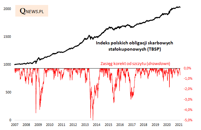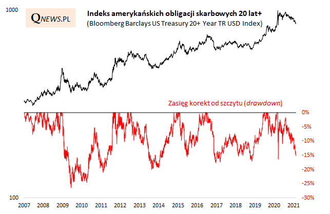Najmocniej ucierpiały obligacje na tzw. długim końcu krzywej rentowności, czyli te o długim okresie do wykupu, a przez to największej wrażliwości (tzw. duration) na wahania rentowności. Indeks papierów 20-letnich i dłuższych zdążył przecenić się o ok. 15% od szczytu. Ale i tutaj korekty potrafiły być jeszcze głębsze, rzędu 20% a nawet 25% (2009 rok).