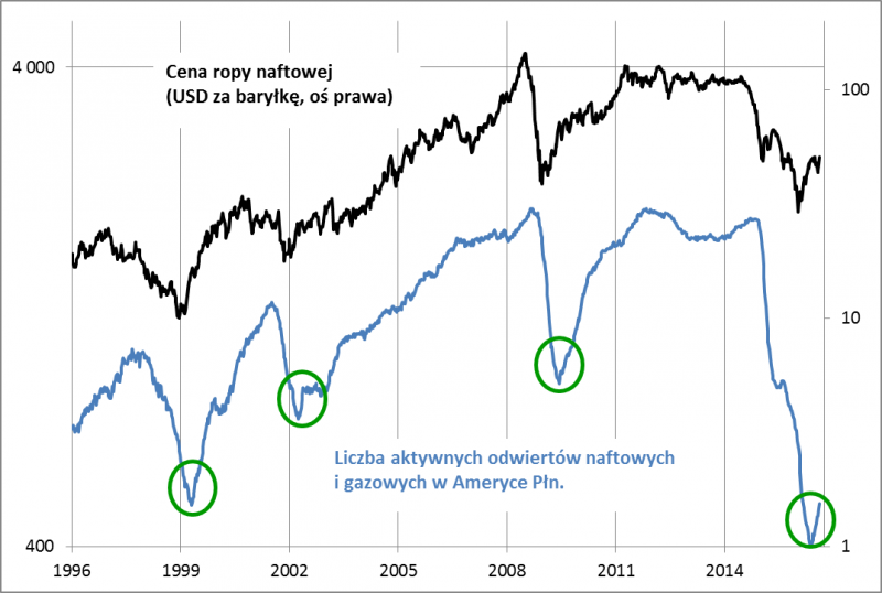 Liczba aktywnych odwiertów (ang. rigs) ropy i gazu to jeden z kluczowych wskaźników tego rynku, przynajmniej jeśli chodzi o Amerykę Płn. Ostra przecena ropy wywołała z pewnym opóźnieniem gwałtowny spadek tego wskaźnika (bo część odwiertów stała się nieopłacalna). Spadek był tak głęboki, że liczba odwiertów osiągnęła poziomy najniższe od co najmniej trzydziestu lat (!). W ostatnich miesiącach trend zaczął się jednak odwracać – wskaźnik znów systematycznie rośnie. Zaletą tego wskaźnika jest to, że historycznie takie punkty zwrotne zawsze zapowiadały dalszą tendencję zwyżkową w perspektywie najbliższych kilku lat, również jeśli chodzi o ceny ropy (krótkoterminowo zdarzała się oczywiście silna zmienność).