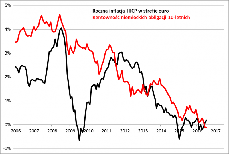 Skoro zaś ropa była historycznie związana z inflacją 70-proc. korelacją, to należałoby oczekiwać, że także wskaźnik inflacji w Eurolandzie powinien w ślad za tym wystartować z obecnych niskich pułapów.