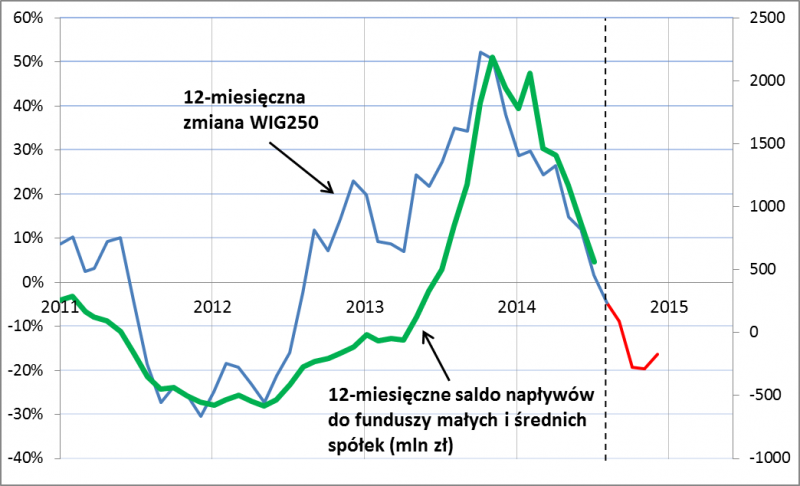 Jak pokazuje wykres saldo wpłat i umorzeń w funduszach małych i średnich spółek jest silnie skorelowane z roczną stopą zwrotu z WIG250. To typowy objaw „pogoni za historycznymi stopami zwrotu” (return chasing) – popyt na daną klasę aktywów jest największy, gdy 12-miesięczne zyski są najwyższe i najmniejszy (ujemny), gdy zyski są najniższe (ujemne). Pozostawiając na boku kwestię tego czy zjawisko to jest racjonalne, można zakładać, że nakreślony przez naszą symulację dalszy spadek rocznych stóp zwrotu z WIG250 trwający do X/XI będzie wiązał się z dalszymi odpływami/brakiem napływów w tej klasie aktywów. Szacunki te prowadzą do wniosku, że na jesieni 12-miesięczne saldo wpłat i umorzeń może być już wyraźnie ujemne, co będzie można kontrariańsko traktować jako zachętę do kupowania niechcianych akcji „misiów”.