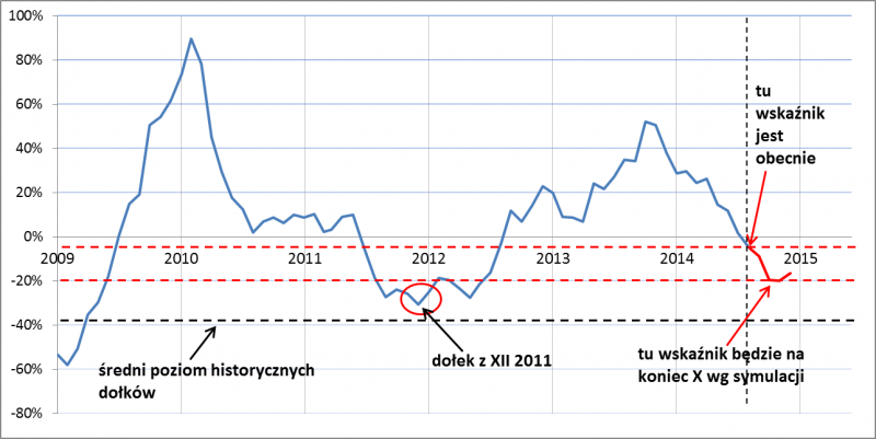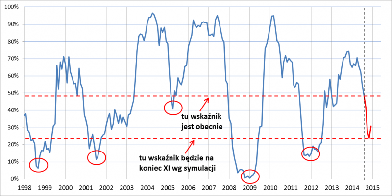 I tutaj można narzekać, że mimo wyraźnego obniżenia się, wskaźnik ciągle nie jest jeszcze na poziomach, które na ogół w przeszłości zapowiadały odwrócenie tendencji na wzrostową. Poprzednie pięć dołków ukształtowało się na poziomie średnio zaledwie 15 proc. Dokładnie na tym pułapie zakończył się ostatni cykl, na jesieni 2011 r.