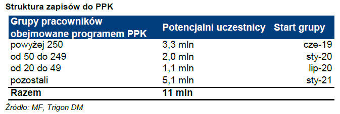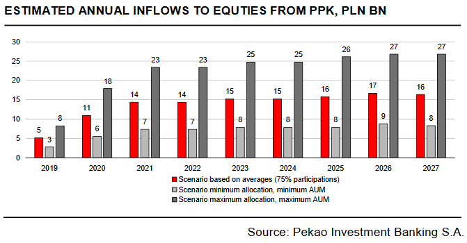 Brokerzy zgodnie zakładają, że rozwój PPK będzie oznaczał nowe, stałe źródło popytu na polskie akcje. Pekao Investment Banking szacuje, że już w przyszłym roku na polski rynek akcji może trafić z tego źródła od 3 do 8 mld zł świeżego kapitału. W kolejnych dwóch latach te kwoty mają wyraźnie urosnąć. Trudno je precyzyjnie oszacować, bo nie wiadomo jaki procent uczestników będzie zapisany w systemie (rząd oczekuje 75%; teoretycznie z programu można będzie się wypisać, ale stworzono mechanizmy zachęt i ponownego automatycznego zapisu co 4 lata), oraz czy będą wpłacać minimalne czy może podwyższone składki i jaką dokładnie strukturę będą miały inwestowane przez fundusze oszczędności w ramach PPK.