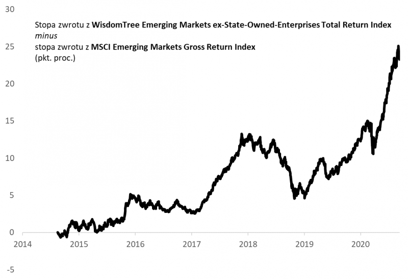 Co ciekawe WisdomTree od 2014 roku publikuje autorski indeks rynków wschodzących wykluczający SOE. Na wykresie stopy zwrotu z tego indeksu na własną rękę porównaliśmy z wynikami popularnego benchmarku MSCI Emerging Markets. Także tutaj widać wyraźnie lepsze wyniki (z tym zastrzeżeniem, że oba indeksy są liczone wg niekoniecznie identycznej metodologii).
