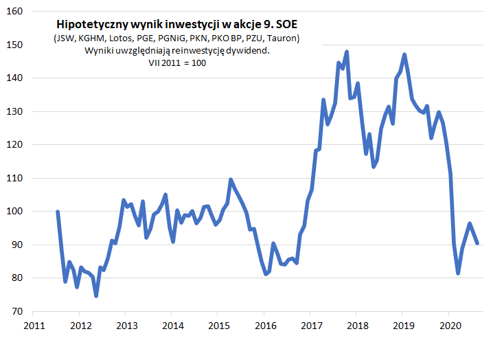 Oczywiście jeszcze raz podkreślmy, że nasze obliczenia nie pretendują do miana rygorystycznego naukowego wywodu. Niemniej wydaje się, że coś jest na rzeczy. Krajowe SOE wg naszej próbki w horyzoncie ostatnich przeszło dziewięciu lat okazały się średnio rzecz biorąc słabą inwestycją. Dalszych badań wymagałaby odpowiedź na pytanie w jakim stopniu te rezultaty są skutkiem niskiej efektywności SOE, a w jakim np. obniżenia się wycen ich akcji, czyli aspektu czysto rynkowego. Niemniej jakiś czas temu badając długoterminowe stopy zwrotu z całego indeksu WIG20, w którym SOE odgrywają tak kluczową rolę, stwierdziliśmy, że przyczyną słabych stóp zwrotu jest przede wszystkim brak długoterminowego wzrostu zysków ogółu spółek z tego koszyka (co by potwierdzało przypuszczenia odnośnie problemu z niską efektywnością SOE).
