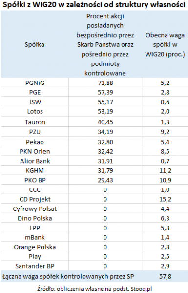 Przede wszystkim nie ma wątpliwości co do tego, że GPW bliżej ciągle zdecydowanie do rynków wschodzących niż rozwiniętych, jeśli chodzi o wagę SEO. Jak pokazujemy w tabeli, w koszyku flagowego indeksu WIG20 znajduje się obecnie 11 spółek, które można zakwalifikować jako kontrolowane przez państwo (bezpośrednio lub pośrednio ponad 20 proc. akcji). Łącznie mają one prawie 58 proc. udziału w benchmarku.