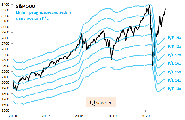 Można jednocześnie powiedzieć, że jeszcze nigdy nie obserwowaliśmy tak gwałtownego wzrostu zagregowanego wskaźnika wycen. Przecież jeszcze w dołku ostatniego krachu był on lekko poniżej historycznej średniej. Tak dramatyczny „re-rating” (podniesienie wycen) w tak krótkim czasie, to coś absolutnie niespotykanego – trudno go wytłumaczyć inaczej jak tylko odwołując się do równie niespotykanej skali stymulacji fiskalno-monetarnej.
