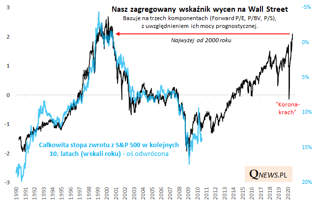 Sęk w tym, że tezę o drożyźnie na Wall Street potwierdzają również alternatywne wskaźniki. Nasza zagregowana miara, bazująca nie tylko na prognozowanym P/E, ale też P/BV (cena/wartość księgowa) i P/S (cena/sprzedaż), zawędrowała właśnie najwyżej od … 2000 roku. Wg tego kryterium wyceny na najważniejszym rynku akcji są ponad dwa odchylenia standardowe powyżej historycznej średniej. Z czymś takim mieliśmy wcześniej do czynienia wyłącznie w kulminacyjnym etapie bańki internetowej na przełomie wieków.
