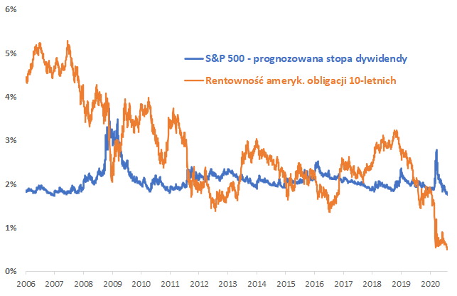 - Mimo to akcje na Wall Street są ciągle atrakcyjniej wycenione niż bardzo drogie (mało rentowne) obligacje skarbowe, z którymi od zawsze konkurują.