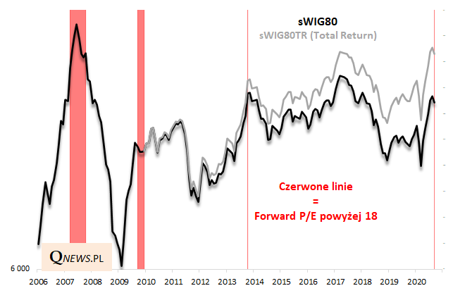 Podstawowe zastrzeżenie do tych rozważań to trudności w określeniu wiarygodności tych danych (nie znamy szczegółowej metodologii; pewne jest, że dla sporej części małych spółek w ogóle nie ma prognoz analityków). P/E w wersji opartej na zyskach historycznych nie jest tymczasem na wygórowanych poziomach, co utrudnia jednoznaczną ocenę sytuacji.