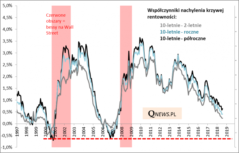 Co jednocześnie ciekawe obie te metodologie uwzględniają najlepsze naszym zdaniem kryterium nadejścia rychłej bessy - krzywą rentowności obligacji. BAML pokazuje - zgodnie z naszymi obserwacjami - że nie doszło jeszcze do odwrócenia krzywej, a to zawsze było potrzebne do pojawienia się rynku niedźwiedzia (z kolei GS uwzględnia jedynie samo "spłaszczanie się" krzywej).