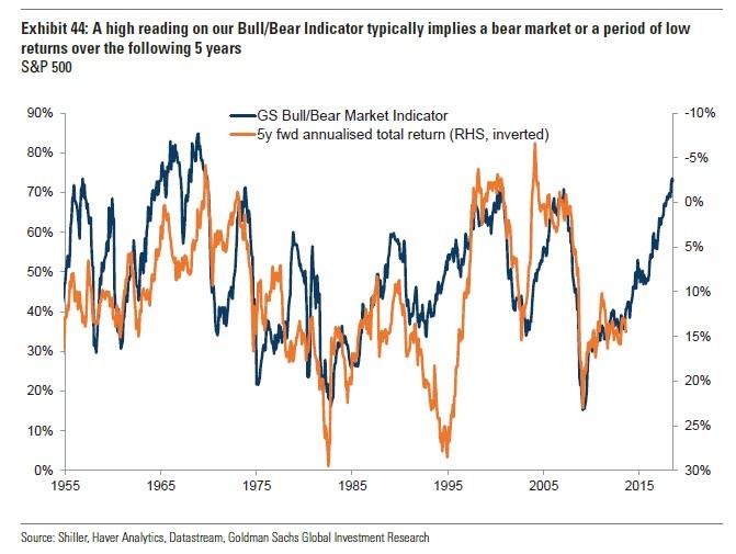 Analitycy GS wskazują jednak inny, być może bardziej użyteczny, sposób wykorzystania swojego wskaźnika. Chodzi o to, że historycznie pozwalałby on na ogół całkiem nieźle (choć z bardzo poważnymi wyjątkami - patrz lata 90.) prognozować przyszłe, pięcioletnie stopy zwrotu.
