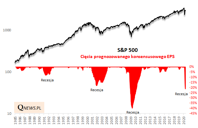 Ostre cięcia prognoz zysków spółek, zarówno na Wall Street jak i globalnie, to jeden z charakterystycznych elementów obecnej sytuacji. Jak pokazujemy na powyższym wykresie "konsensusowe" prognozy EPS (zysku na akcję) w przypadku indeksu S&P 500 zostały ścięte o ponad 20%. Jedynym epizodem we współczesnej historii, kiedy cięcia szacunków były jeszcze głębsze, był globalny kryzys finansowy 2008-09.
