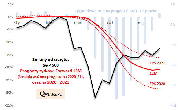 - wraz z upływem czasu forward EPS (będący średnią ważoną prognoz na 2020 i 2021) w coraz większym stopniu uwzględnia szacunki na przyszły rok, które są wyższe niż na te na bieżący rok (różnica w szacunkach na te dwa lata uległa wyraźnemu rozszerzeniu - bieżący rok często określany jest jako "stracony").