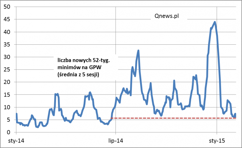 Do tego dochodzą kolejne ciekawe obserwacje. Dostrzegamy postępujący zanik nowych 52-tygodniowych minimów notowań wśród spółek na GPW. Tak więc o ile o hossie ciągle trudno mówić, to jednak mamy do czynienia z konsekwentnym wygaszaniem negatywnych zjawisk, a to już coś.