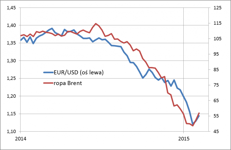 Na rynku ropy naftowej obserwujemy pierwszą większą próbę podniesienia notowań. Dokładnie to samo można powiedzieć o kursie euro względem dolara - widać, że oba rynki są silnie powiązane (ceny ropy są wyrażane w dolarach). Póki co nie ma jednak jeszcze przesłanek, by traktować odbicie cen jako definitywną zmianę trendu. Zmiany takie zwykle następują bowiem w sposób stopniowy.