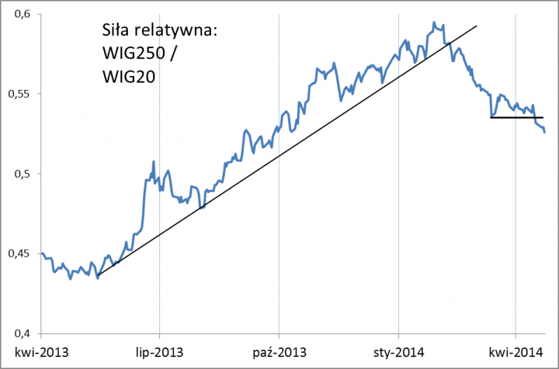 Wygląda na to, że niepokojące zjawiska dostrzeżone przez nas w marcu (Mieszane sygnały płynące z wykresów; Słabość małych spółek to zastanawiający sygnał) są kontynuowane. Wskaźnik tzw. siły relatywnej WIG250 względem WIG20 konsekwentnie pogłębia dołki, co jest całkowitą odmianą sytuacji z ubiegłego roku.