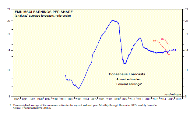 Prognozowane zyski spółek z indeksu MSCI EMU (gromadzi 10 krajów rozwiniętych ze strefy euro)
