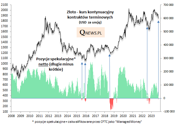 Jeżeli sprawdzimy co historycznie zapowiadała taka nietypowa przewaga "niedźwiedzi" na rynku kontraktów na złoto, to okaże się, że był to stan rzeczy charakterystyczny dla końcowej fazy trendu spadkowego. Niekoniecznie definitywne dno było osiągane od razu po takim sygnale, a czasem przewaga krótkich pozycji potrafiła osiągnąć dużo większe rozmiary niż obecnie, ale była to już zawsze końcówka przeceny.