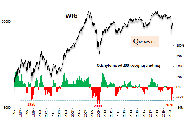 Pierwsza mocniejsza korekta spadkowa na GPW od marca to okazja, by ponownie odwołać się do naszych rozważań z początku kwietnia, w których porównywaliśmy "korona-krach" do poprzednich tego rodzaju zapaści z lat 2008 i 1998 (definiowanych jako głębokie oderwanie się indeksu od 200-sesyjnej średniej).